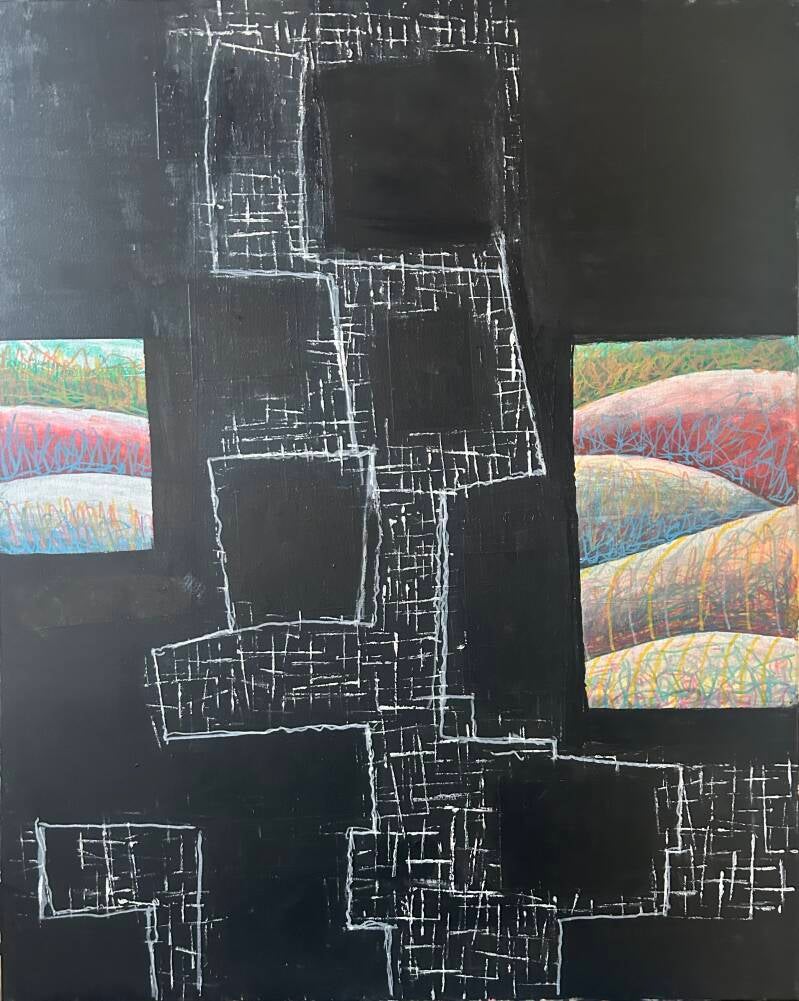 The second painting is more recent, and was done in acrylic paint. After many hours of hard but useless work, it was transformed inch by inch over the previous couple of months to the very pink and black image on the right, and I thought it was done. Eventually though, it became the second target for renovation and work began again over the past week. In the fourth image below it is whiter, greyer and less pink, and finished.