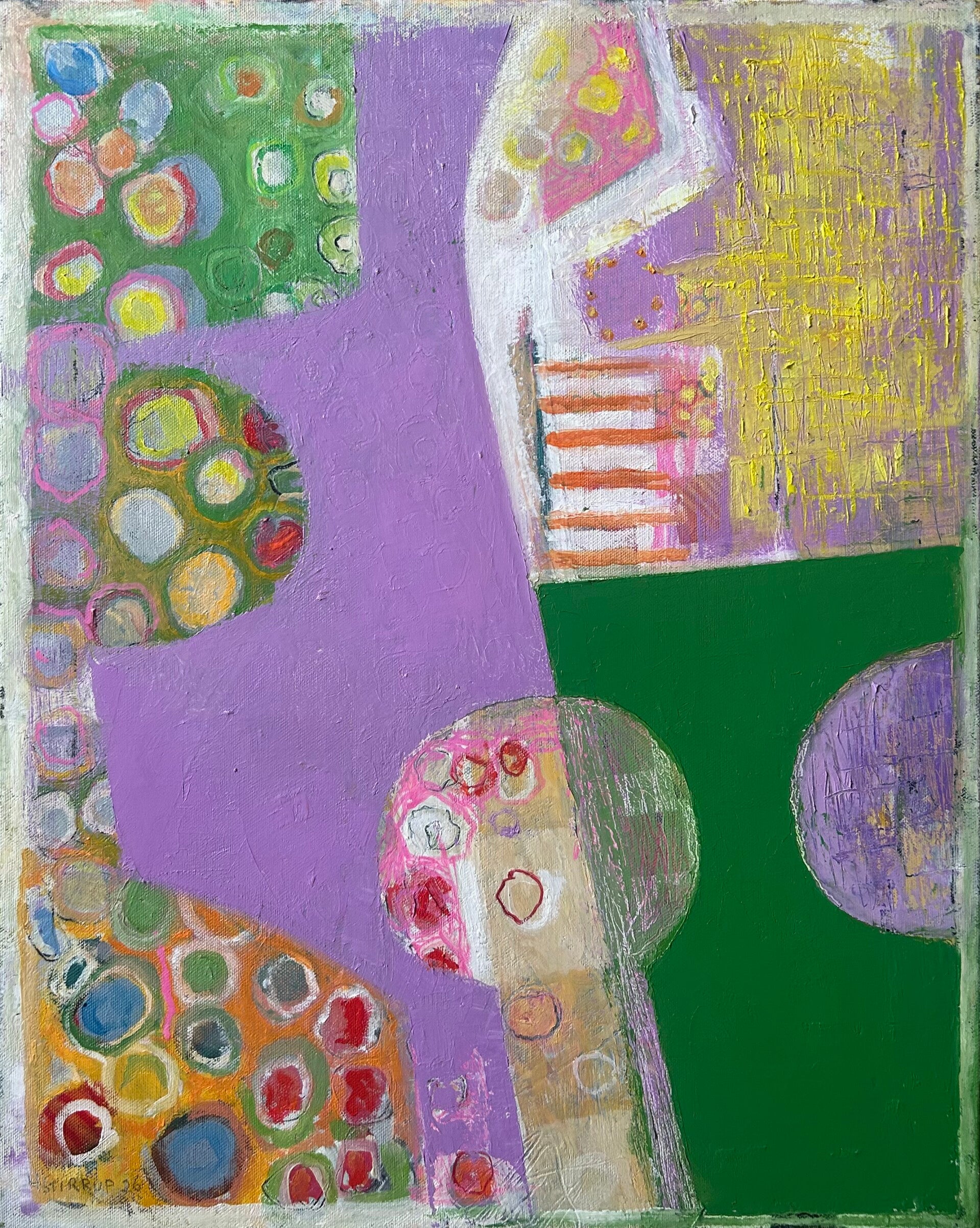 So, armed with my dream colours, lilac, green, dark brown etc., I set off on a painting spree next morning, and for three days. As I said, I re-worked three older paintings, and feeling very violent towards them I painted, scraped off and moved the colours about. These were 30x40 cm. Then I began two new paintings, a bit bigger, on new canvases. It was hard work as usual for a 78 year old, but I like what was happening. It was a process, a process which had to be gone through - two steps forward, one step back - and leading somewhere. The activity was written and visible on the surfaces of the paintings, and about one hundred cotton buds fulfilled their destinies in the process. I now have five paintings I'm calling finished. Here they are. Click on them for detailed views.
